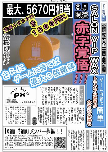 ご無沙汰しておりました いきなりですが・・・ 今月でtamuは2周年を迎えさせていただきました 有難うございます もちろんいろんな企画をかんがえて降りますよ そお第一弾を飾るのは・・・・ 覚えてる方も多いと思います 1年半前にsadaが考えたあの企画 いくら儲かるか、なんなら儲からないかもしれないあの企画 あの企画がかえってきます 企画詳細はコチラ→http://hairbasetamu.blog.shinobi.jp/Entry/52/ WAXが無くなり次第終了となります これからもストロングスタイルで行きたいと思います |